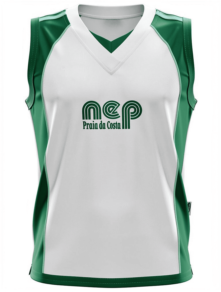 Camiseta branca NEP Praia da Costa, 65% poliéster e 35% viscose, leve e de fácil cuidado.